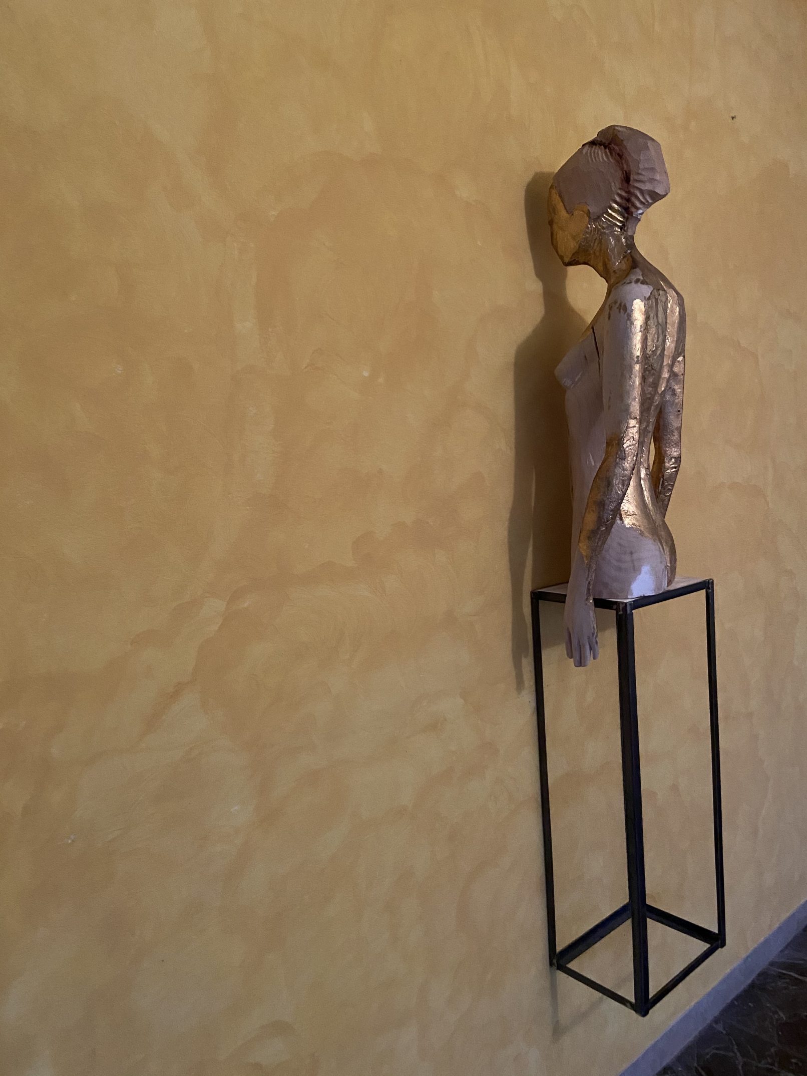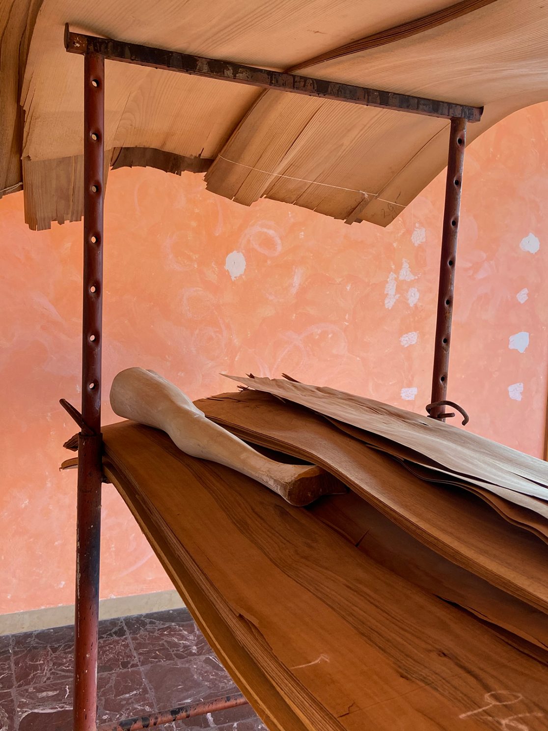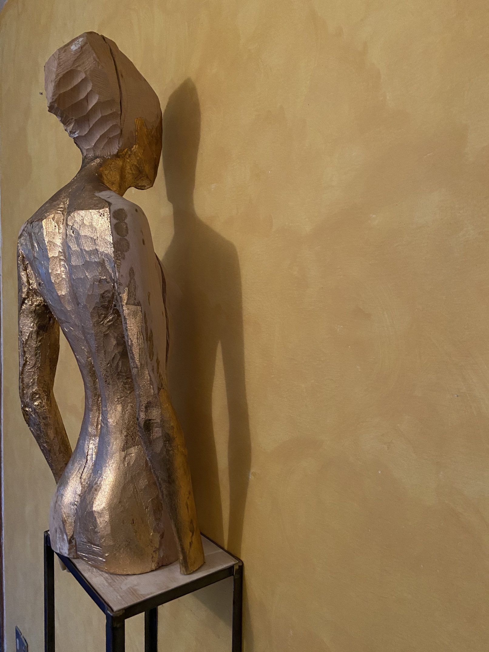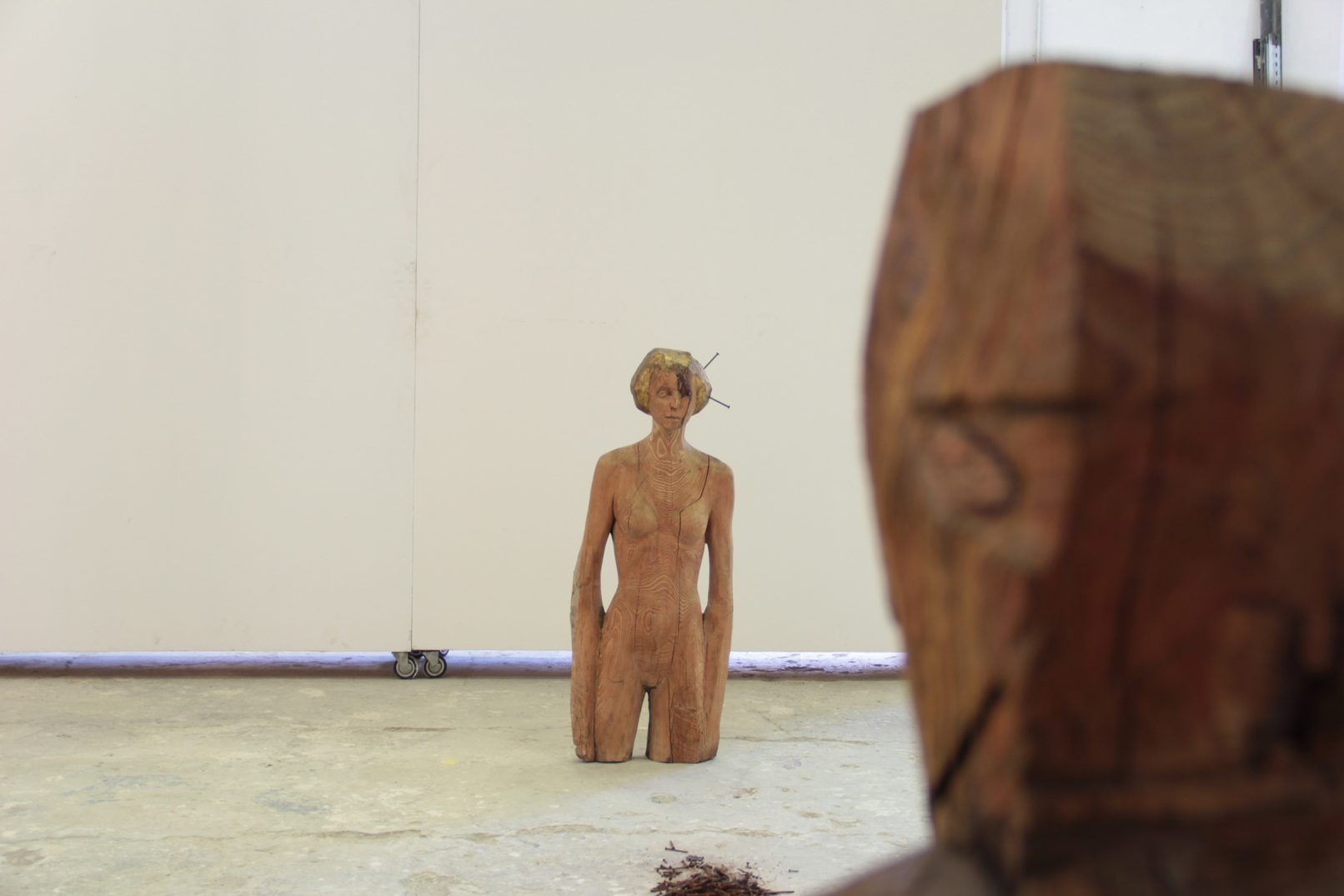 Manfrini’s practice always aims to an action of sorting and removing, and in this sense steadydiet refers to a poor nourishment, minimum and essential, basically the way someone who is on a strict diet eats. The human figures stand hieratic and their shape is barely roughed down; some of them still have the sapwood’s veining and colors typical of the larch, the tree from which they are born and of which, above all, they keep the inner life, namely the nature that is still alive in the wood fibres and enclosed within the veneer. These sculptures could tell the story of centuries-old larches which witnessed the human activities in the woods of Trentino over all these years: here is where the artist lives, and it’s the grounded place related to that deep, essential root that Manfrini conveys in his sculptures.